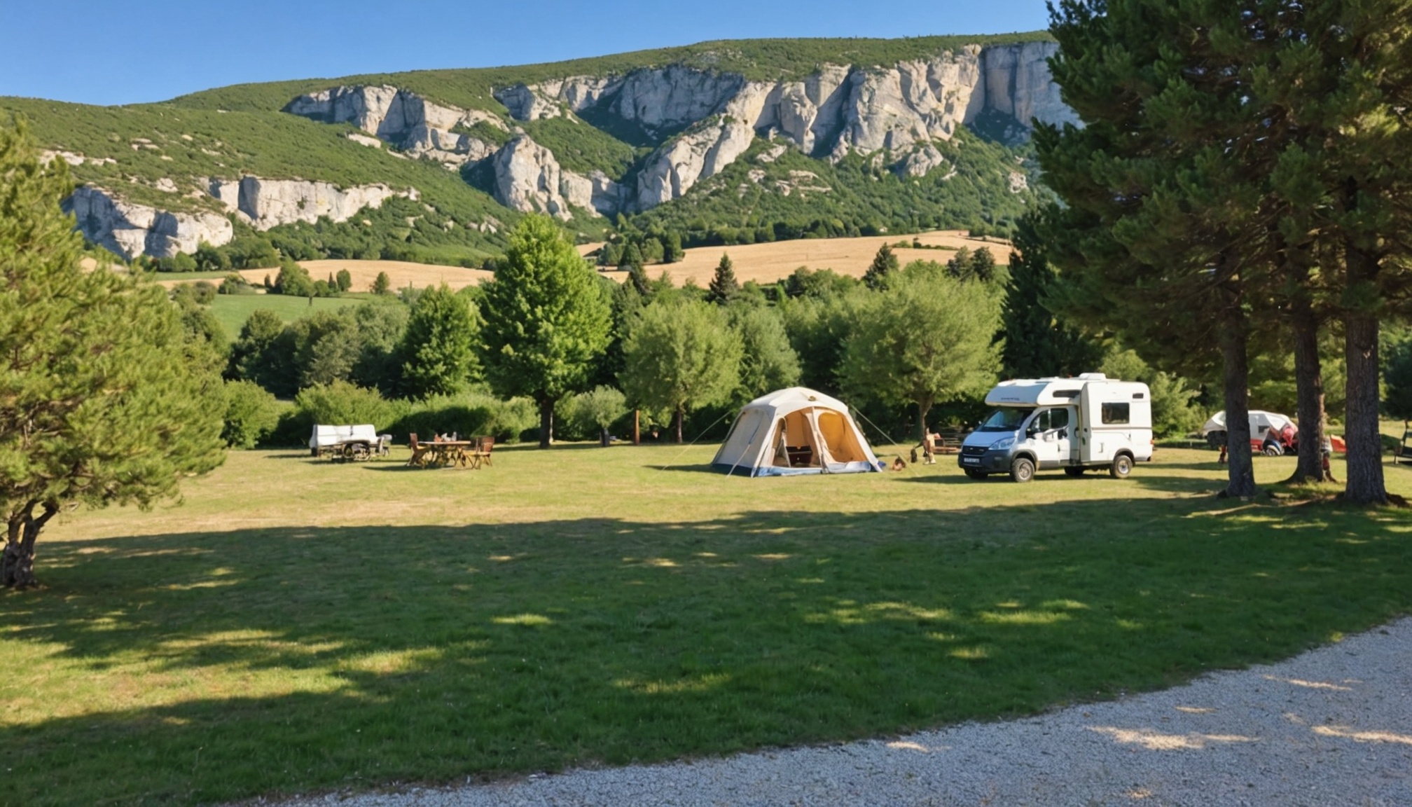 - Superficie minimale de 120 m² : Un emplacement spacieux Drôme doit mesurer au minimum 120 m² pour accueillir confortablement tente, caravane ou camping-car avec l'équipement annexe. Cette surface garantit l'espace nécessaire pour l'auvent, les chaises et le rangement sans empiéter sur les passages.